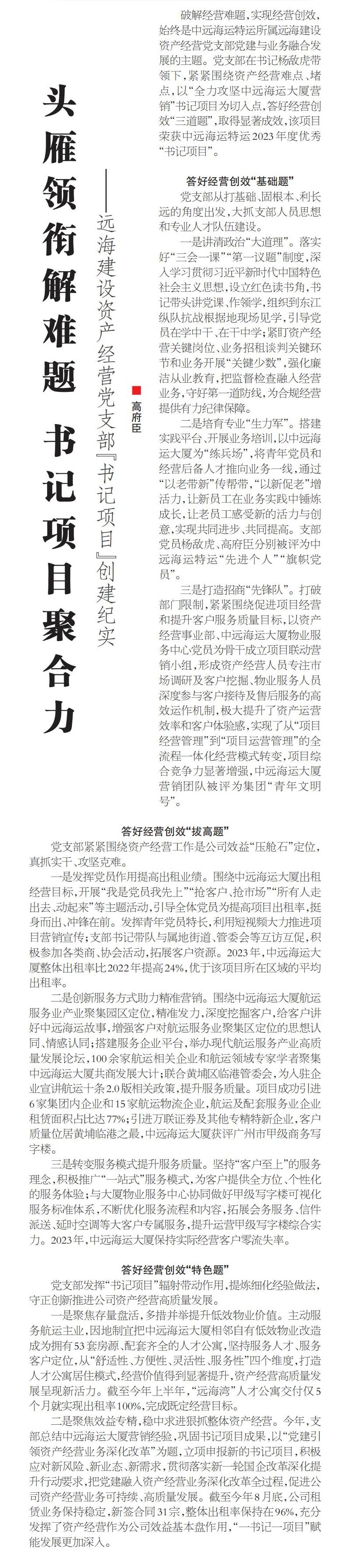 《中国远洋海运报》2024年9月20日总第1507期A4版,刊登广州中远海运建设实业有限公司员工高府臣的文章:头雁领衔解难题 书记项目聚合力——远海建设资产经营党支部『书记项目』创建纪实。 全文如下: 破解经营难题,实现经营创效,始终是中远海运特运所属远海建设资产经营党支部党建与业务融合发展的主题。党支部在书记杨敌虎带领下,紧紧围绕资产经营难点、堵点,以“全力攻坚中远海运大厦营销”书记项目为切入点,答好经营创效“三道题”,取得显著成效,该项目荣获中远海运特运2023年度优秀“书记项目”。 答好经营创效“基础题” 党支部从打基础、固根本、利长远的角度出发,大抓支部人员思想和专业人才队伍建设。 一是讲清政治“大道理”。落实好“三会一课”“第一议题”制度,深入学习贯彻习近平新时代中国特色社会主义思想,设立红色读书角,总书记带头讲党课、作领学,组织到东江纵队抗战根据地现场见习,引导党员在学中干、在干中学;紧盯资产经营关键岗位、业务招租谈判关键环节和业务开展“关键少数”,强化廉洁从业教育,把监督检查融入经营业务,守好第一道防线,为合规经营提供有力纪律保障。 二是培育专业“生力军”。搭建实践平台、开展业务培训,以中远海运大厦为“练兵场”,将青年党员和经营后备人才推向业务一线,通过“以老带新”传帮带,“以新促老”增活力,让新员工在业务实践中锤炼成长,让老员工感受新的活力与创意,实现共同进步、共同提高。支部党员杨敌虎、高府臣分别被评为中远海运特运“先进个人”“旗帜党员”。 三是打造招商“先锋队”。打破部门限制,紧紧围绕促进项目经营和提升客户服务质量目标,以资产经营事业部、中远海运大厦物业服务中心党员为骨干成立项目联动营销小组,形成资产经营人员专注市场调研及客户挖掘、物业服务人员深度参与客户接待及售后服务的高效运作机制,极大提升了资产运营效率和客户体验感,实现了从“项目经营管理”到“项目运营管理”的全流程一体化经营模式转变,项目综合竞争力显著增强,中远海运大厦营销团队被评为集团“青年文明号”。 答好经营创效“拔高题” 党支部紧紧围绕资产经营工作是公司效益“压舱石”定位,真抓实干、攻坚克难。 一是发挥党员作用提高出租业绩。围绕中远海运大厦出租经营目标,开展“我是党员我先上”“抢客户、抢市场”“所有人走出去、动起来”等主题活动,引导全体党员为提高项目出租率,挺身而出、冲锋在前。发挥青年党员特长,利用短视频大力推进项目营销宣传;支部书记带队与属地街道、管委会等互访互促,积极参加各类商、协会活动,拓展客户资源。2023年,中远海运大厦整体出租率比2022年提高24%,优于该项目所在区域的平均出租率。 二是创新服务方式助力精准营销。围绕中远海运大厦航运服务业产业聚集园区定位,精准发力,深度挖掘客户,给客户讲好中远海运故事,增强客户对航运服务业聚集区定位的思想认同、情感认同;搭建服务企业平台,举办现代航运服务产业高质量发展论坛,100余家航运相关企业和航运领域专家学者聚集中远海运大厦共商发展大计;联合黄埔区临港管委会,为入驻企业宣讲航运十条2.0版相关政策,提升服务质量。项目成功引进6家集团内企业和15家航运物流企业,航运及配套服务业企业租赁面积占比达77%;引进万联证券及其他专精特新企业,客户质量位居黄埔临港之最,中远海运大厦获评广州市甲级商务写字楼。 三是转变服务模式提升服务质量。坚持“客户至上”的服务理念,积极推广“一站式”服务模式,为客户提供全方位、个性化的服务体验;与大厦物业服务中心协同做好甲级写字楼可视化服务标准体系,不断优化服务流程和内容,拓展会务服务、信件派送、延时空调等大客户专属服务,提升运营甲级写字楼综合实力。2023年,中远海运大厦保持实际经营客户零流失率。 答好经营创效“特色题” 党支部发挥“书记项目”辐射带动作用,提炼细化经验做法,守正创新推进公司资产经济高质量发展。 一是聚焦存量盘活,多措并举提升低效物业价值。主动服务航运主业,因地制宜把中远海运大厦相邻自有低效物业改造成为拥有53套房源、配套齐全的人才公寓,坚持服务人才、服务客户定位,从“舒适性、方便性、灵活性、服务性”四个维度,打造人才公寓居住模式,经营价值得到显著提升,资产经济高质量发展呈现新活力。截至今年上半年,“远海湾”人才公寓交付仅5个月就实现出租率100%,完成既定经营目标。 二是聚焦效益专精,稳中求进狠抓整体资产经营。今年,支部总结中远海运大厦营销经验,巩固书记项目成果,以“党建引领资产经营业务深化改革”为题,立项申报新的书记项目,积极应对新风险、新业态、新需求,贯彻落实新一轮国企改革深化提升行动要求,把党建融入资产经营业务深化改革全过程,促进公司资产经营业务可持续、高质量发展。截至今年8月底,公司租赁业务保持稳定,新签合同31宗,整体出租率保持在96%,充分发挥了资产经营作为公司效益基本盘作用,“一书记一项目”赋能发展更加深入。 | ||||||